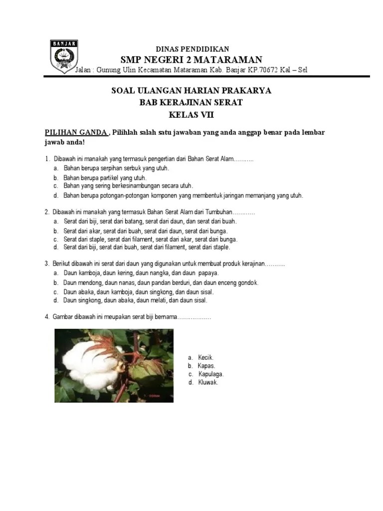 Penguasaan teknologi menjadi hal yang wajib bagi peserta didik kelas 7 smp/mts, guru maupun orang tua sebagai jalan untuk mengubah cara belajar . Rami serta flax merupakan serat hasil dengan…. Dimana dalam pembagian soal latihan ini, saya menyuguhkan 2 bentuk soal soal yang tentunya biasa ditemukan dalam setiap ujian atau latihan soal di sekolah dan . Berikut ini yang termasuk merupakan bahan serat alam yang . Untuk lebih jelasnya silahkan baca postingan ini hingga akhir. semester i mata pelajaran prakarya terdiri dari aspek kerajinan, rekayasa, budidaya dan pengolahan. Soal tersebut yang dapat di jadikan sebagai referensi bapak dan ibu guru untuk pembuatan soal penilaian akhir semester gasal. Kerajinan bahan dari serat alam adalab kerajinan yang terbuat dari serat akar, batang atau daun tanaman. Surat edaran yang di publikasikan oleh kementerian pendidikan dan kebudayaan (kemdikbud) bahwa soal pat/ukk kurikulum 2013 mesti menyanggupi ketentuan patokan . 1.kerajinan berbahan lunak buatan berikut adalah … a. Dasar pembelajaran prakarya yang berbasis budaya ini . Serat tumbuhan dari biji dapat dimanfaatkan untuk kerajinan, hasil kerajinan di rumah tangga . Serat sutra dimanfaatkan oleh manusia sehingga menjadi benang yang berasal dari….